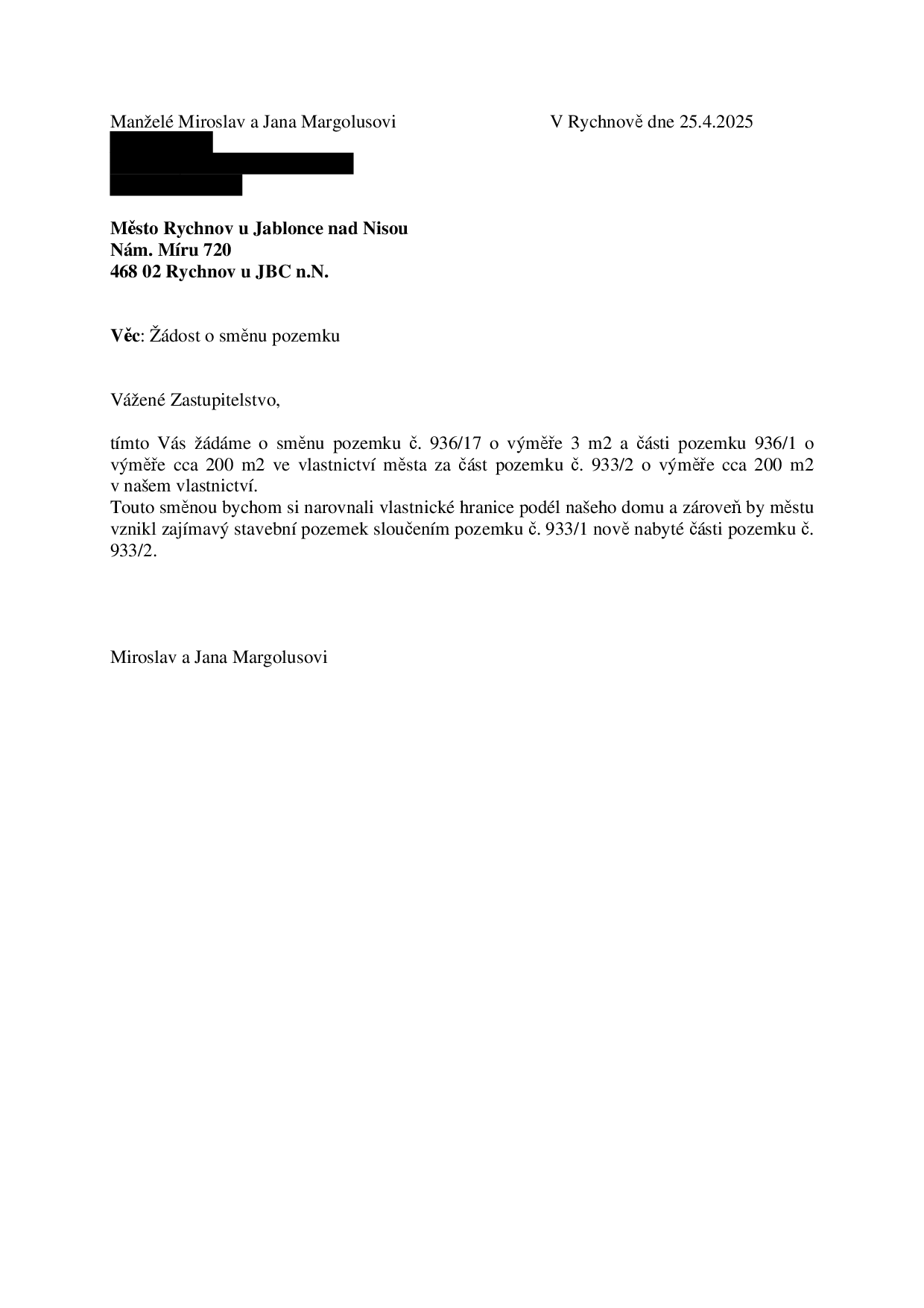 Manželé Margolusovi požádali město o směnu pozemku č. 936/17 o výměře 3 m2 a části pozemku č. 936/1 o výměře cca 200 m2 ve vlastnictví města za část pozemku č. 933/2 o výměře cca 200 m2 v k.ú. Rychnov u Jablonce nad Nisou. Předmětné pozemky jsou dle ÚPD vedené jako plochy určené pro bydlení.