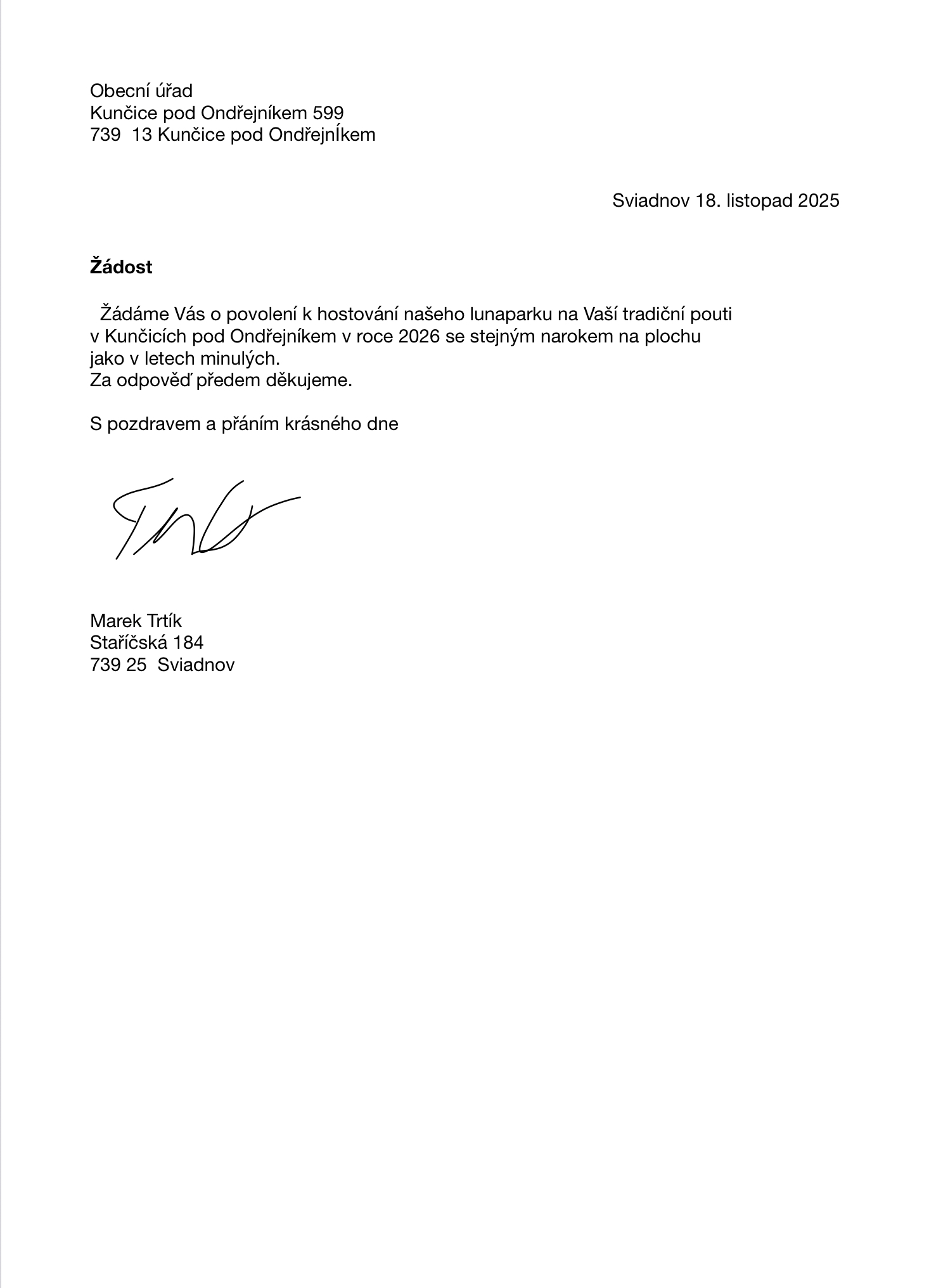 Smlouvu o pronájmu plochy k umísťování pouťových atrakcí a stánků, uzavřenou mezi obcí Kunčice pod Ondřejníkem, IČ: 00296856 a panem Markem Trtíkem, Huslenky 581, IČ: 73257648. Smlouva se uzavírá na termín konání poutě v roce 2026, za cenu 6.000 Kč.