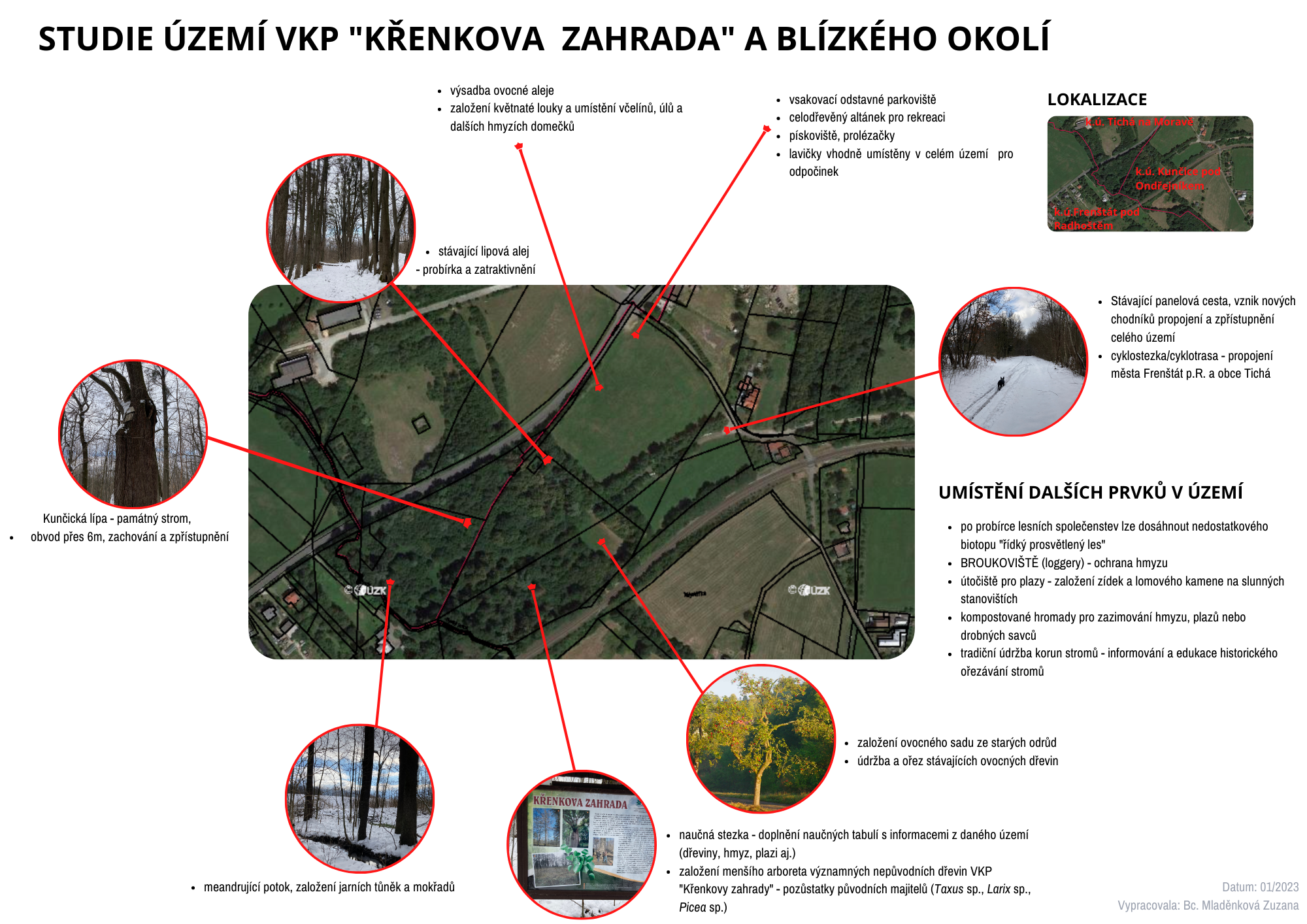 záměr o bezúplatné nabytí pozemků (nebo jejich částí) p. č. st. 318 a p. č. 3511/2, 3192/3, 3202/2, 3202/3 a 3202/4, v k. ú. Kunčice pod Ondřejníkem (LV 2881) za podmínek stanovených firmou DIAMO státní podnik. Zastupitelstvo obce souhlasí s těmito podmínkami pro bezúplatný převod: Projekt Křenkova zahrada bude projektem nepodnikatelským a bude sloužit občanům jako oddychová zóna. Bude zde vybudována naučná lokalita včetně informací i o důlní činnosti, napojení na cyklotrasy v okolí. Křenkova zahrada bude sloužit k ochraně přírody a biodiverzity.