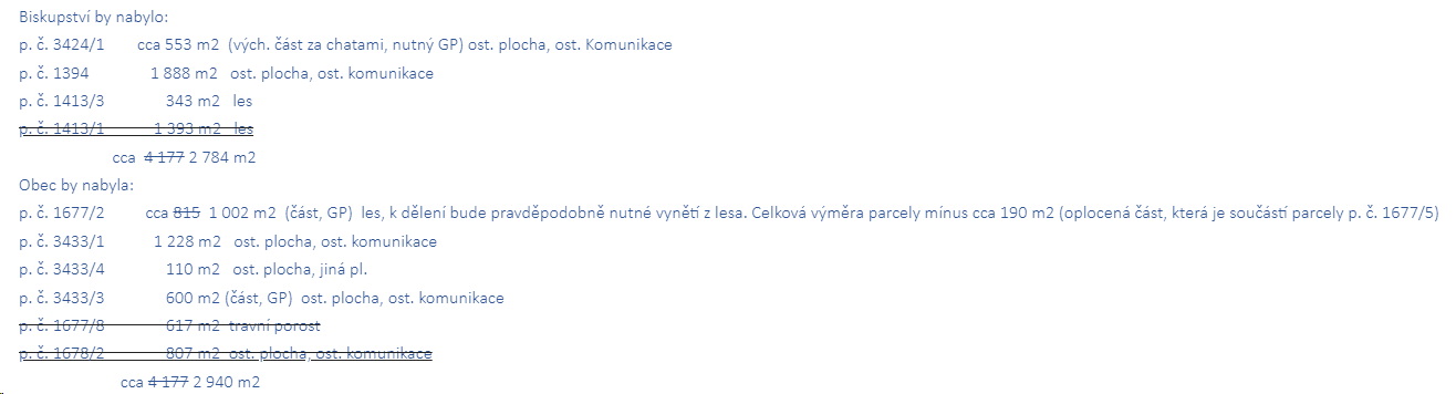 p. č. 1677/2 cca 815 1 002 m2 (část, GP) les, k dělení bude pravděpodobně nutné vynětí z lesa. Celková výměra parcely mínus cca 190 m2 (oplocená část, která je součástí parcely p. č. 1677/5)
