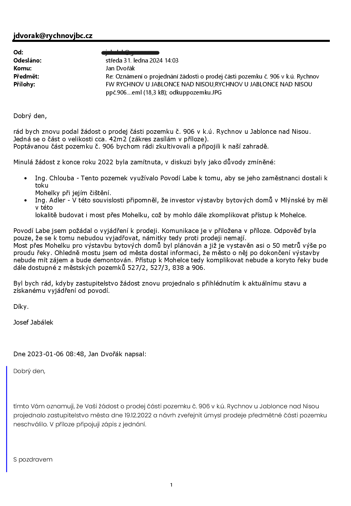 V minulosti již ZM prodej pozemku projednávalo, ale úmysl prodeje neschválilo z obavy, že pozemek využívá Povodí Labe s.p. jako přístup k vodnímu toku Mohelka.