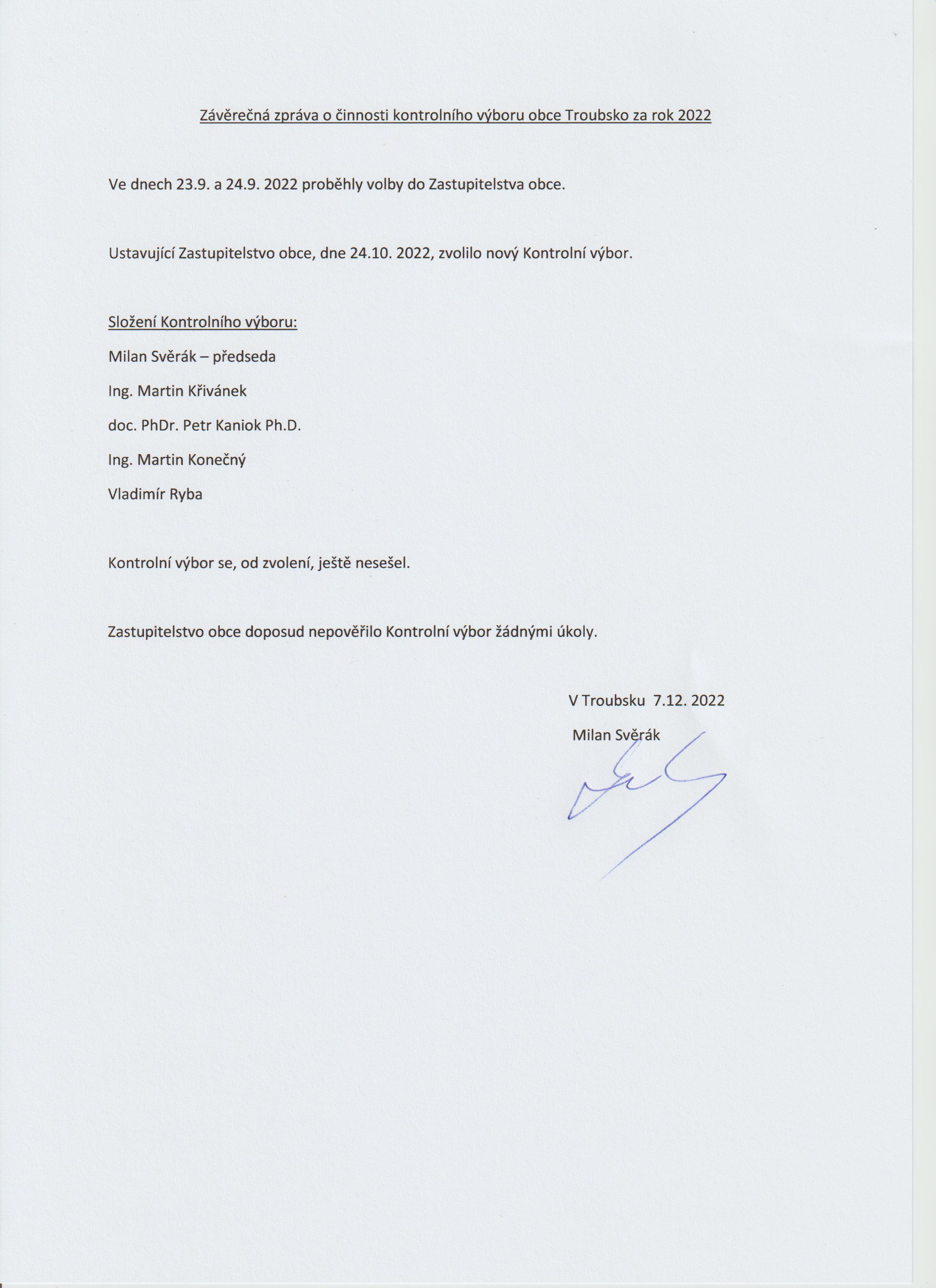 pověřit zastupitelstvo obce Troubsko projednáním stavu požární ochrany v obci 1 x za 12 měsíců nebo vždy po závažné mimořádné události mající vztah k zajištění požární ochrany v obci.