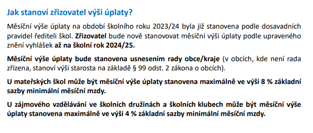a stanovuje výši úplaty za předškolní a zájmové vzdělávání ve školním roce 2025/2026 takto: