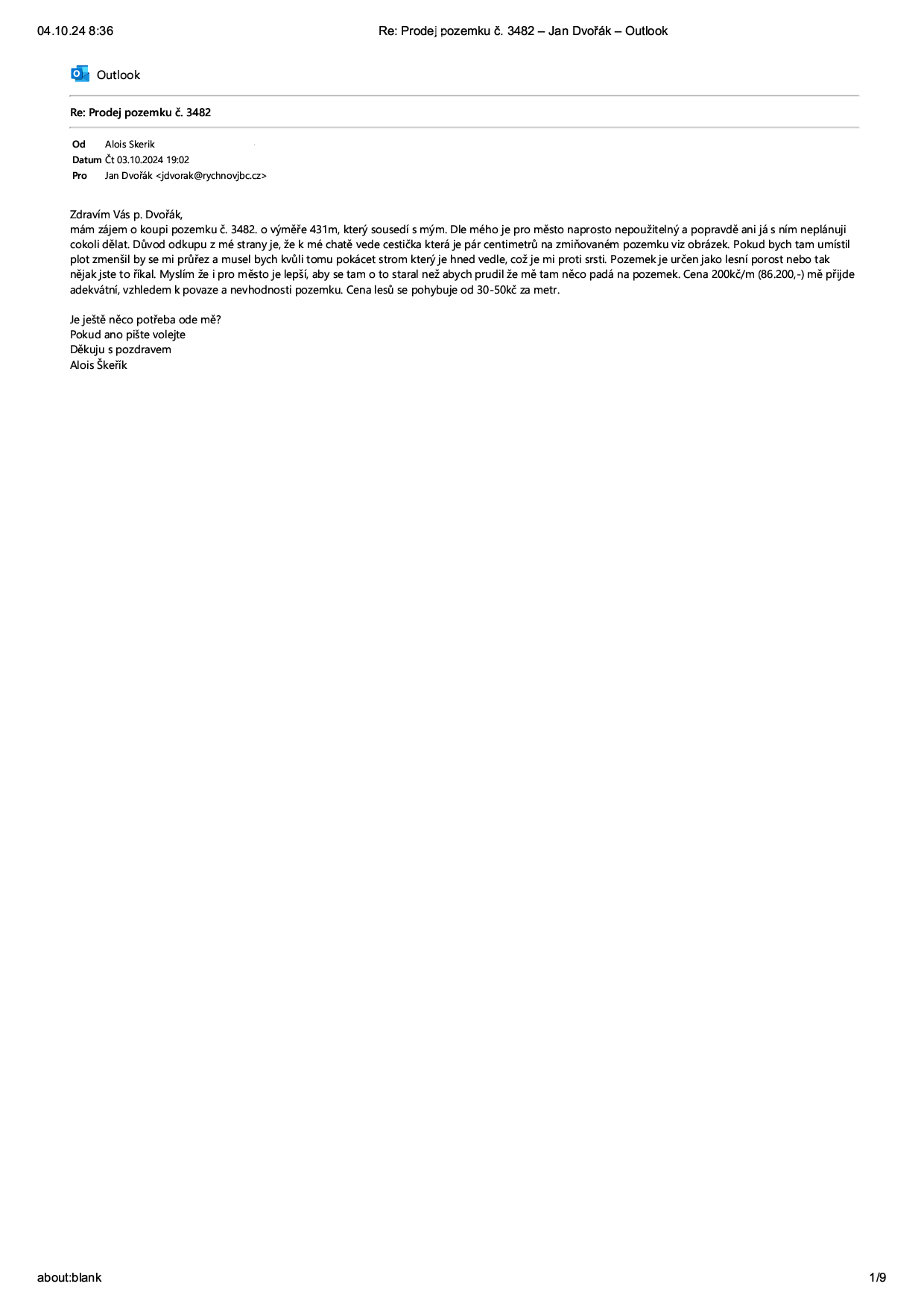 zveřejnit úmysl prodeje pozemku č. 3482 o výměře 431 m2 v k.ú. Rychnov u Jablonce nad Nisou. Termín splnění do 31.12.2025