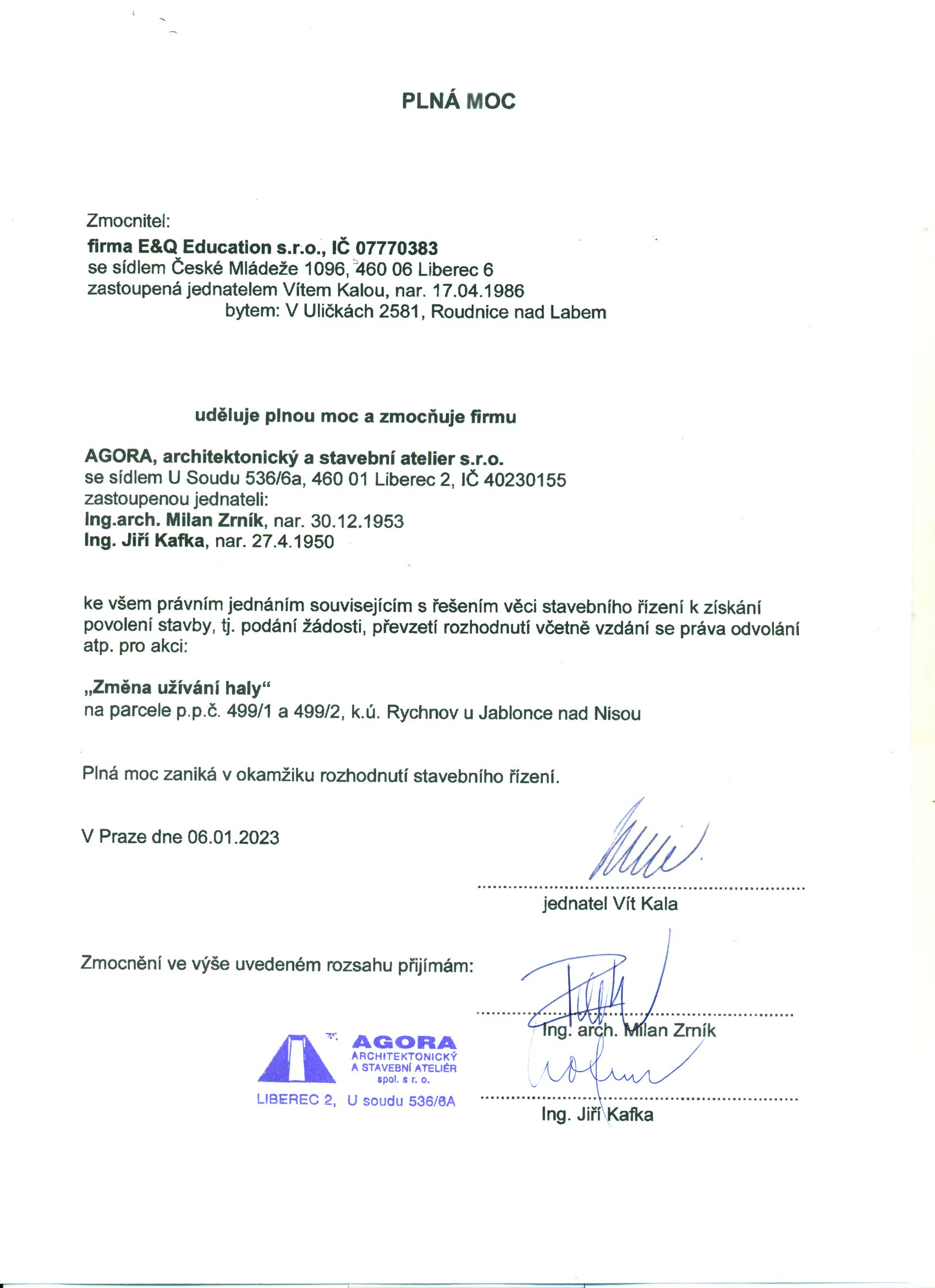 Spol. E&Q Education s.r.o. požádala město o vyjádření ke změně užívání skladové a výrobní haly Údolní 760, Rychnov u Jablonce nad Nisou. Společnost byla vyzvána, aby upřesnila čeho se přesně změna týká a z jakého titulu se má město k navrhované změně vyjadřovat. Zástupce žadatele spol. Agora, architektonický a stavební atelier, spol. s r.o. prostřednictvím pana Ing. arch. Milana Zrníka městu sdělila, že původním účelem hal firmy Ornex s.r.o. bylo skladování, balení a expedice vánočních ozdob. Vytápění bylo zajištěno zemním plynem.